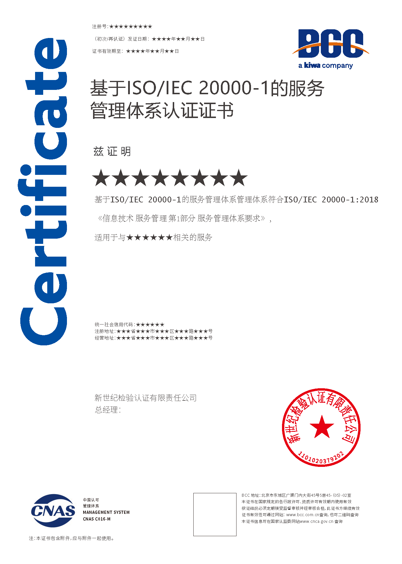 ISO/IEC 20000信息技術服務管理體系,該標準適用于信息技術服務管理行業(yè),是國際上公認的信息技術服務標準。通過運行此標準規(guī)范旨在幫助組織衡量與了解自身的IT服務品質,建立適合企業(yè)的“IT服務管理”流程與方法,提升系統(tǒng)及其服務的可靠性及可用性,促使組織的服務流程更加完善,提升客戶的滿意度,增值企業(yè)的服務價值。