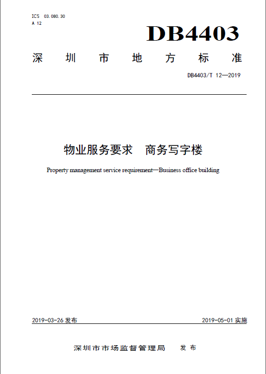 深圳市市場監(jiān)管局自2016年開始籌備物業(yè)服務(wù)認(rèn)證工作,歷經(jīng)三年多,在深圳標(biāo)準(zhǔn)認(rèn)證聯(lián)盟和標(biāo)準(zhǔn)技術(shù)研究院的大力支持下,中航物業(yè)和SGS通標(biāo)標(biāo)準(zhǔn)技術(shù)服務(wù)有限公司經(jīng)過行業(yè)走訪調(diào)研、專業(yè)論證、條款編寫、標(biāo)準(zhǔn)評審,終于在2019年5月1日聯(lián)合發(fā)布了首個(gè)服務(wù)類深圳認(rèn)證標(biāo)準(zhǔn)DB 4403/T 12—2019《物業(yè)服務(wù)要求 商務(wù)寫字樓》,標(biāo)準(zhǔn)引入了先進(jìn)的服務(wù)接觸理論和服務(wù)質(zhì)量評價(jià)模型,從客戶感知和企業(yè)自身管理兩個(gè)角度提出服務(wù)要求和管理要求,結(jié)合深圳市商務(wù)寫字樓的先進(jìn)技術(shù)和先進(jìn)方法,具有較強(qiáng)的科學(xué)性和適用性,達(dá)到了國內(nèi)領(lǐng)先、國際一流水平。認(rèn)證按照深圳標(biāo)準(zhǔn)認(rèn)證聯(lián)盟發(fā)布的首個(gè)服務(wù)認(rèn)證實(shí)施規(guī)則實(shí)施。