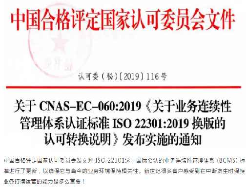 2019年12月31日,中國合格評定國家認(rèn)可委員會(CNAS)發(fā)布了關(guān)于CNAS-EC-060:2019《關(guān)于業(yè)務(wù)連續(xù)性管理體系認(rèn)證標(biāo)準(zhǔn)ISO22301:2019換版的認(rèn)可轉(zhuǎn)換說明》發(fā)布實施的通知。