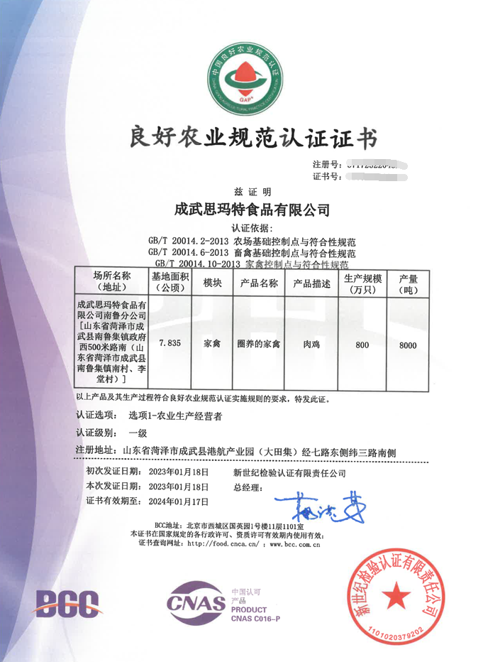 為推動產業(yè)品種升級、飼養(yǎng)升級、屠宰升級和品牌升級,成武思瑪特食品有限公司(以下簡稱:成武思瑪特)兩個養(yǎng)殖基地雙雙順利通過了BCC實施的良好農業(yè)規(guī)范(GAP)檢查工作,并獲得中國GAP+家禽模塊(肉禽)一級認證證書(最高級別)。