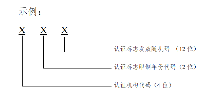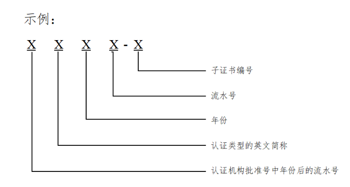 內(nèi)資認證機構(gòu)認證證書編號為該機構(gòu)批準(zhǔn)號的3位或4位阿拉伯?dāng)?shù)字流水號;外資認證機構(gòu)認證證書編號為F+該機構(gòu)批準(zhǔn)號的2位或3位阿拉伯?dāng)?shù)字流水號。