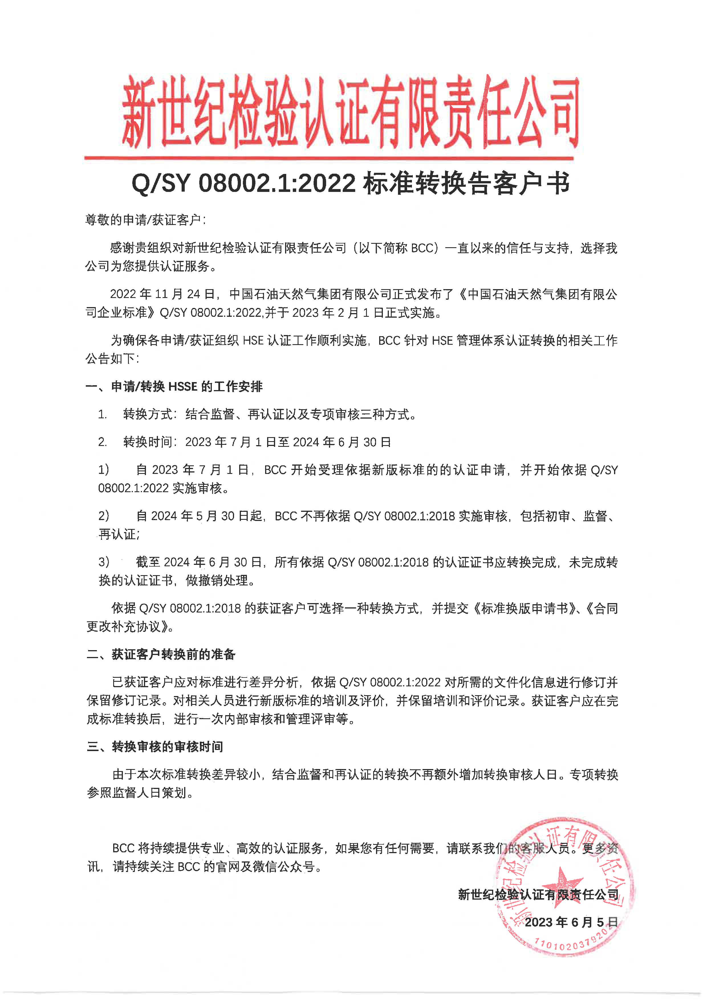 Q/SY 08002.1:2022標準轉(zhuǎn)換告客戶書