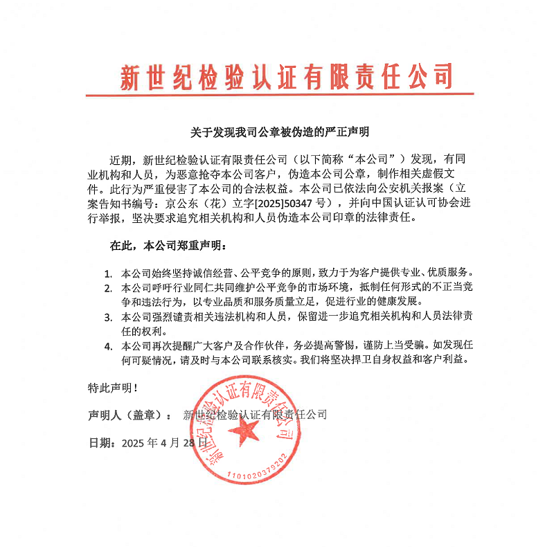 近期,新世紀(jì)檢驗(yàn)認(rèn)證有限責(zé)任公司(以下簡(jiǎn)稱(chēng) “本公司 ” )發(fā)現(xiàn),有同業(yè)機(jī)構(gòu)和人員,為惡意搶奪本公司客戶,偽造本公司公章,制作相關(guān)虛假文件。此行為嚴(yán)重侵害了本公司的合法權(quán)益。本公司已依法向公安機(jī)關(guān)報(bào)案(立案告知書(shū)編號(hào): 京公東(花)立字[2025]50347號(hào)),并向中國(guó)認(rèn)證認(rèn)可協(xié)會(huì)進(jìn)行舉報(bào),堅(jiān)決要求追究相關(guān)機(jī)構(gòu)和人員偽造本公司印章的法律責(zé)任。