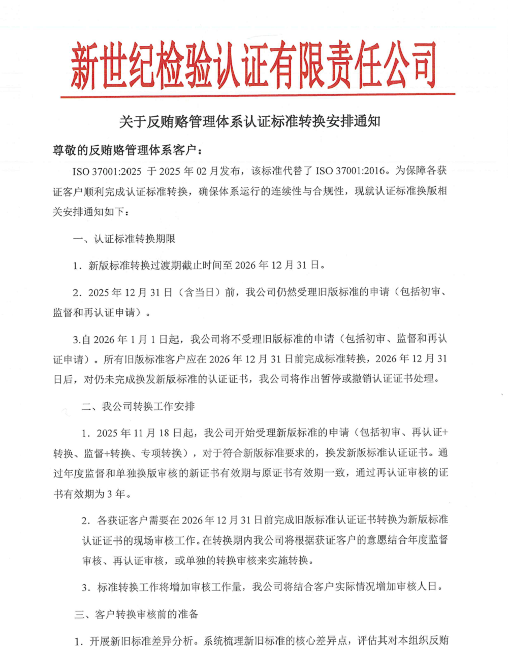 關于反賄賂管理體系認證標準轉(zhuǎn)換安排通知