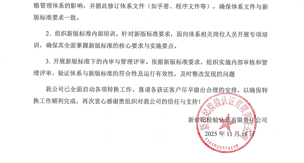 3.自2026年1月1日起,我公司將不受理舊版標準的申請(包括初審、監(jiān)督和再認證申請)。所有舊版標準客戶應在2026年12月31日前完成標準轉(zhuǎn)換,2026年12月31日后,對仍未完成換發(fā)新版標準的認證證書,我公司將作出暫?;虺蜂N認證證書處理。