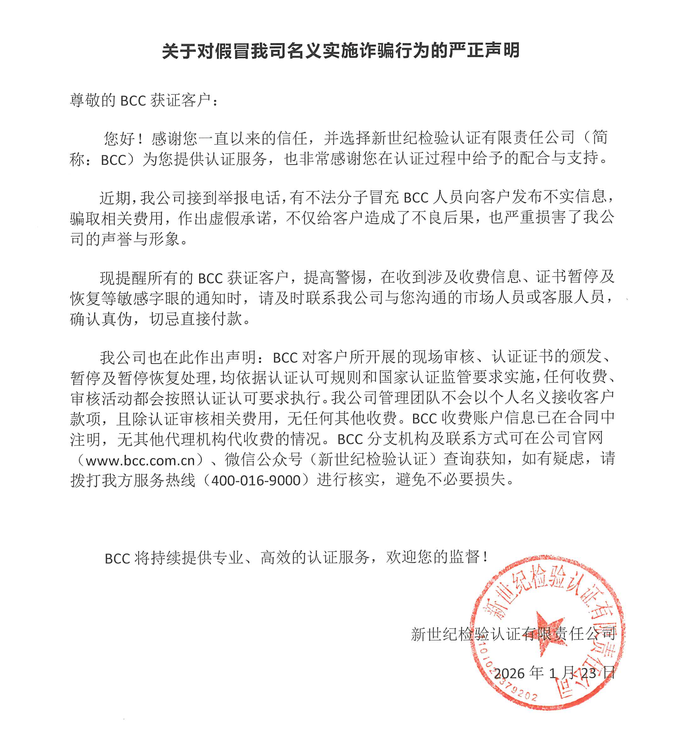 我公司也在此作出聲明:BCC對客戶所開展的現(xiàn)場審核、認證證書的頒發(fā)、暫停及暫?;謴?fù)處理,均依據(jù)認證認可規(guī)則和國家認證監(jiān)管要求實施,任何收費、審核活動都會按照認證認可要求執(zhí)行。我公司管理團隊不會以個人名義接收客戶款項,且除認證審核相關(guān)費用,無任何其他收費。BCC收費賬戶信息已在合同中注明,無其他代理機構(gòu)代收費的情況。BCC分支機構(gòu)及聯(lián)系方式可在公司官網(wǎng)(m.bijoux-carador.com)、微信公眾號(新世紀檢驗認證)查詢獲知,如有疑慮,請撥打我方服務(wù)熱線(400-016-9000)進行核實,避免不必要損失。